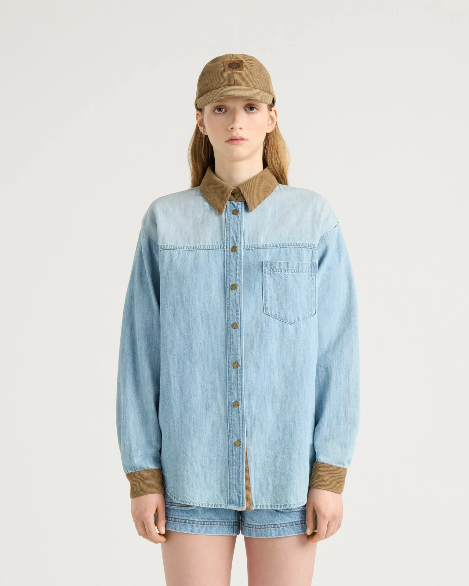 Cacouna est une chemise en denim essentielle avec col et poignets en velours côtelé.