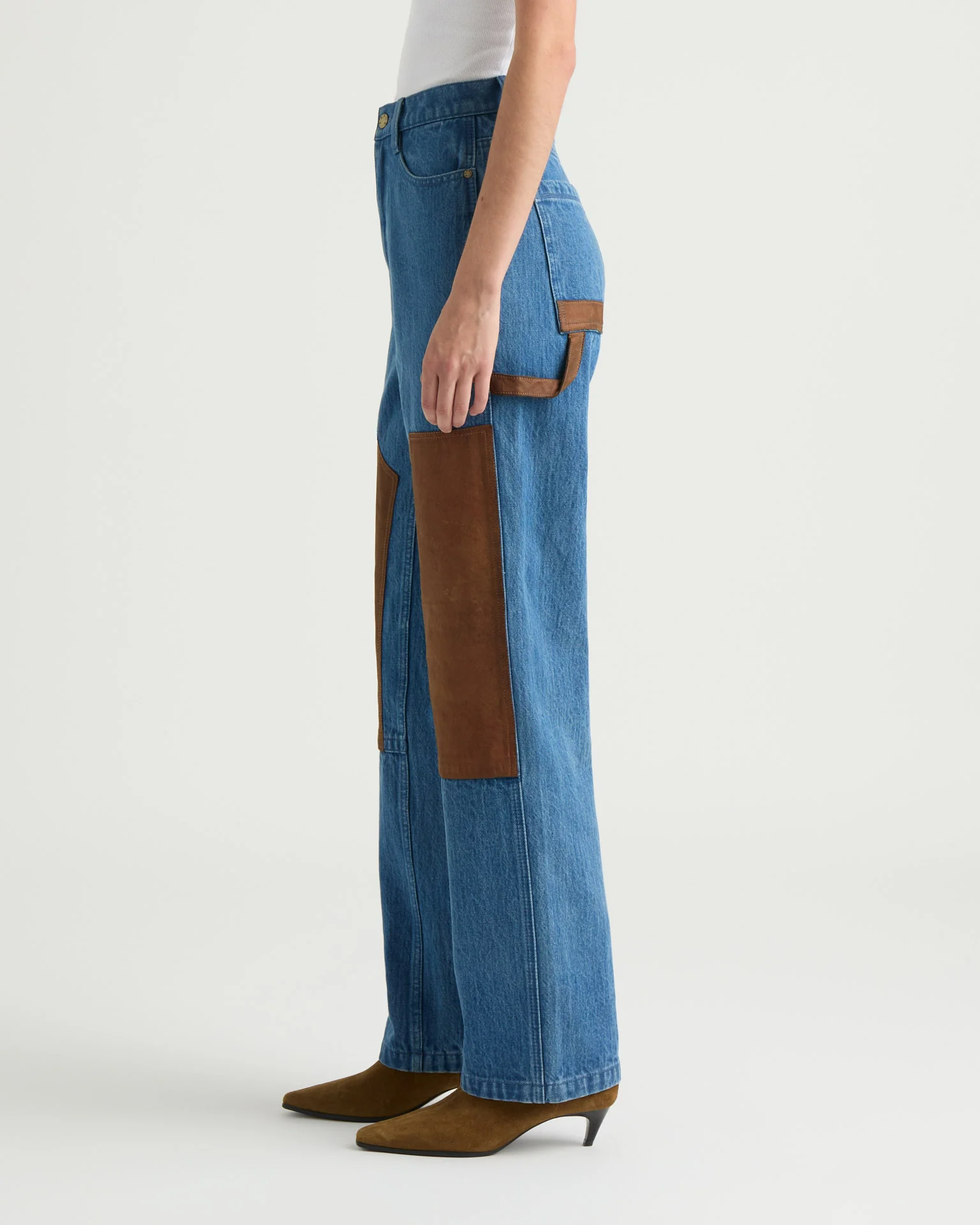 Carcajou est un jean taille haute, coupe droite, avec des patchs en nubuck style charpentier.
