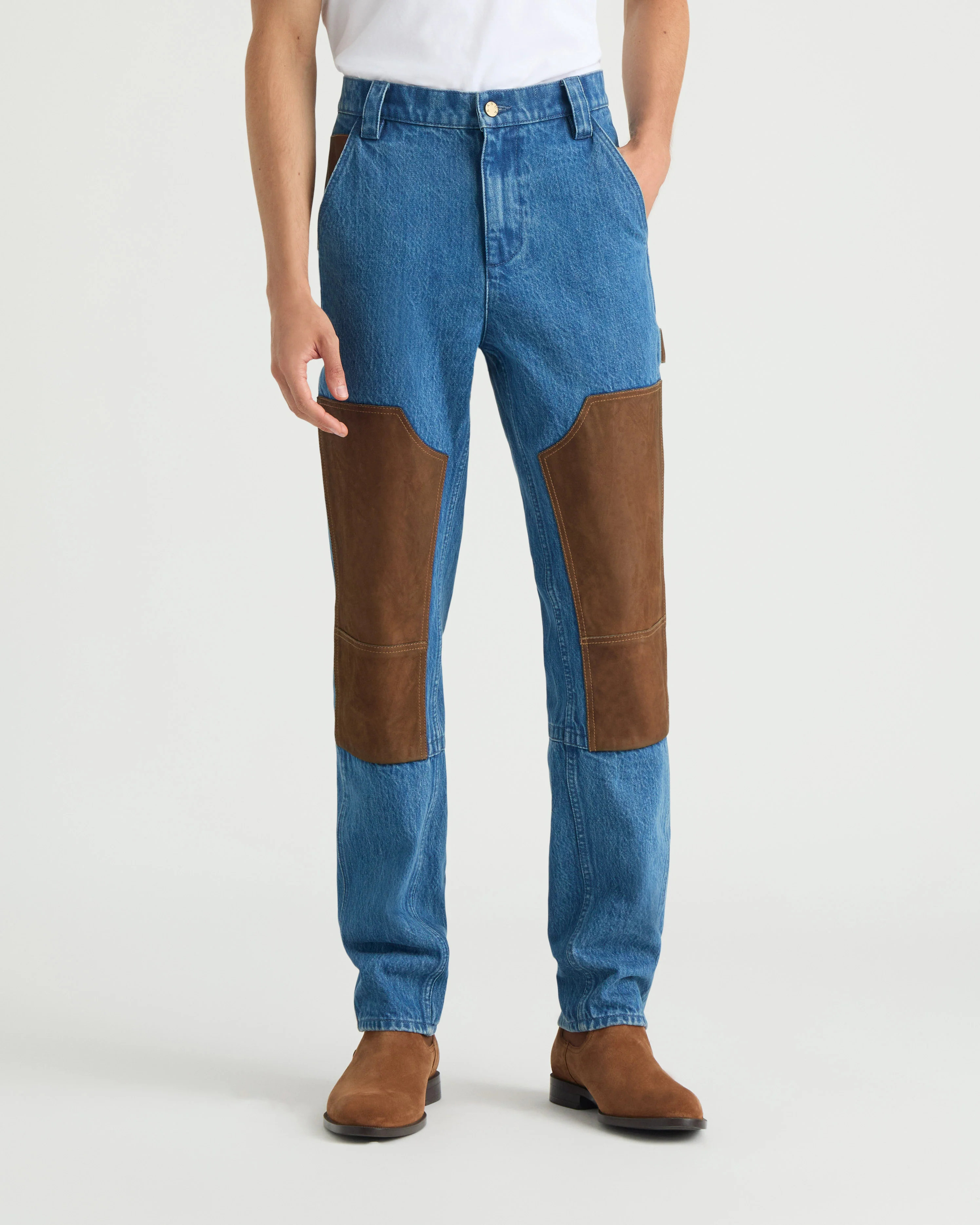 Gatineau est un pantalon en denim à jambe droite avec des patchs de style charpentier.