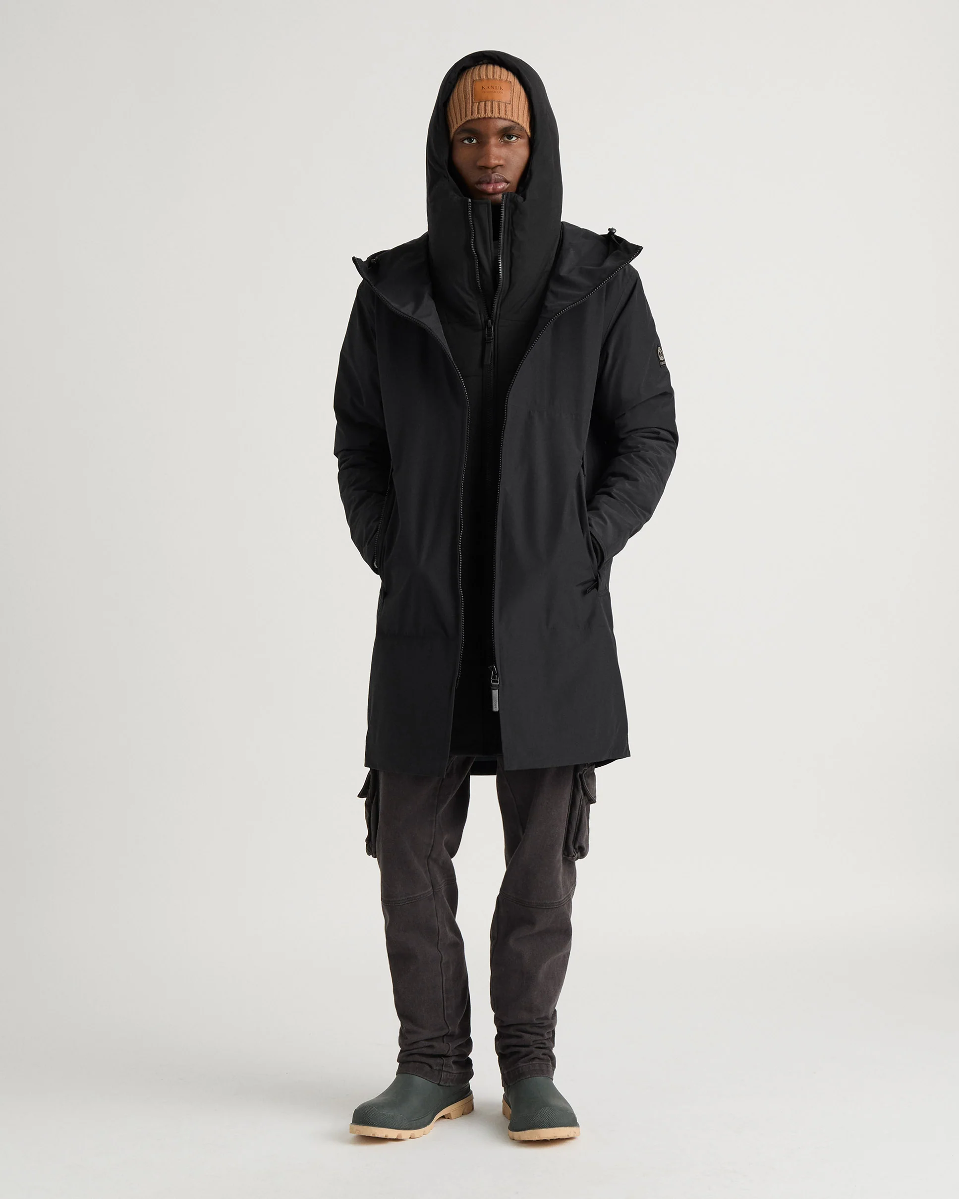 Halloway est un manteau 3-en-1 mi-mollet avec une couche intérieure isolante, des poches pour réchauffer les mains et un capuchon élastique ajustable.