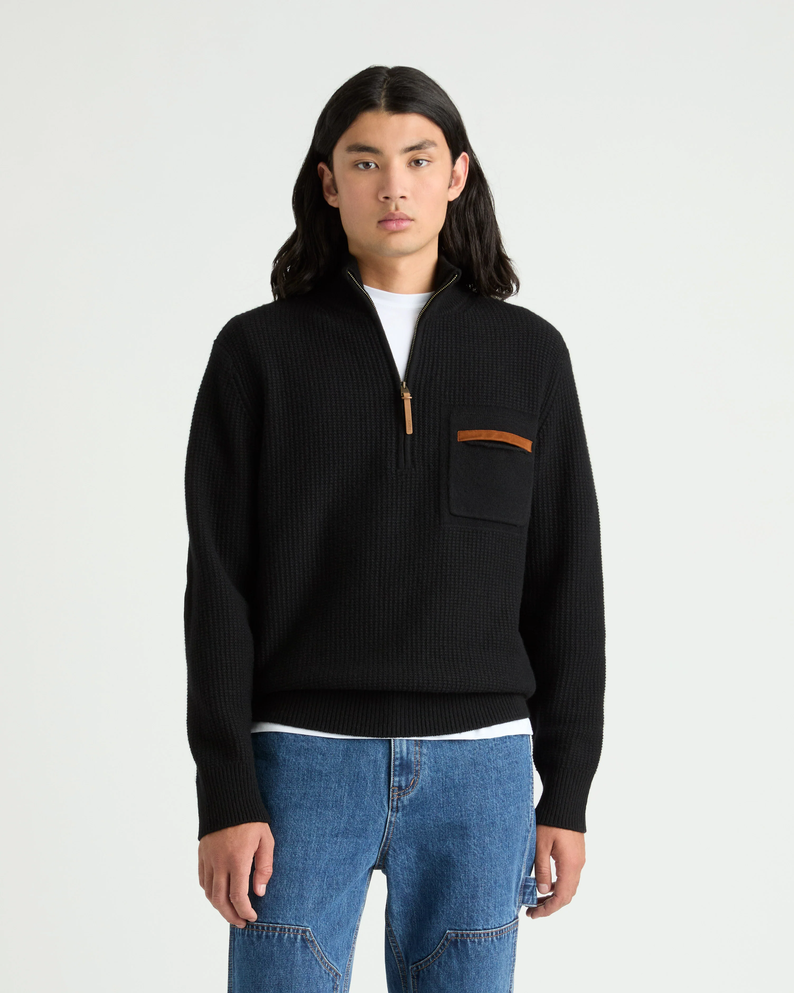 Griffon est un pull à demi-fermeture éclair en laine-cachemire, agrémenté de finitions en nubuck et de coudières.