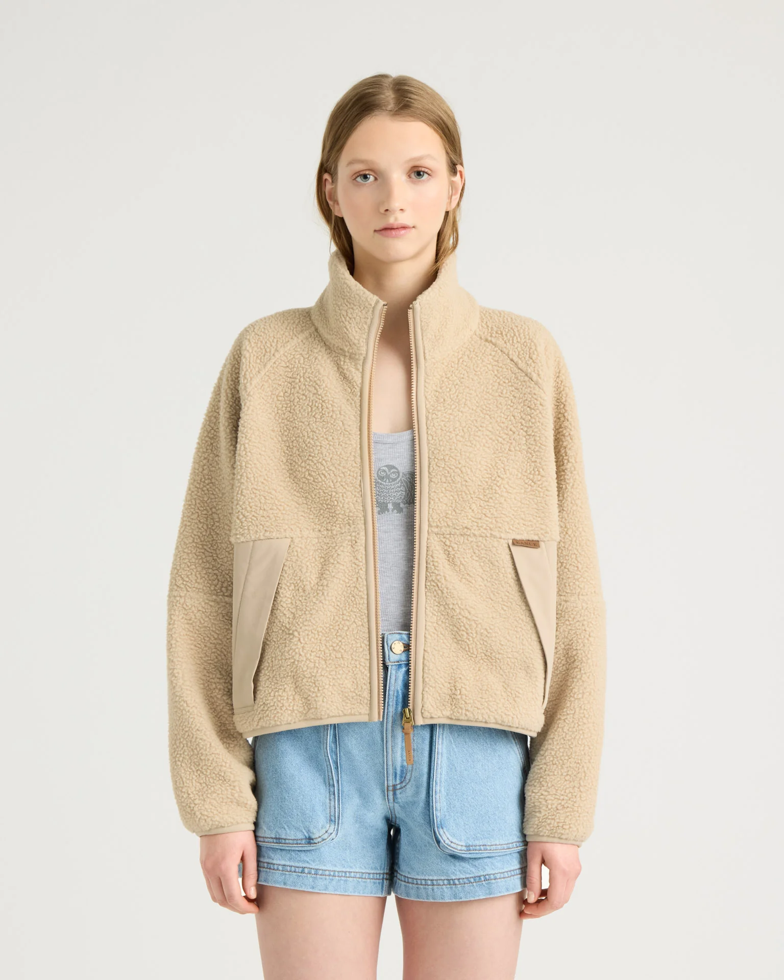 Bécassine est un un polar moutonné zippé avec un col montant et des poches en nylon extensible.